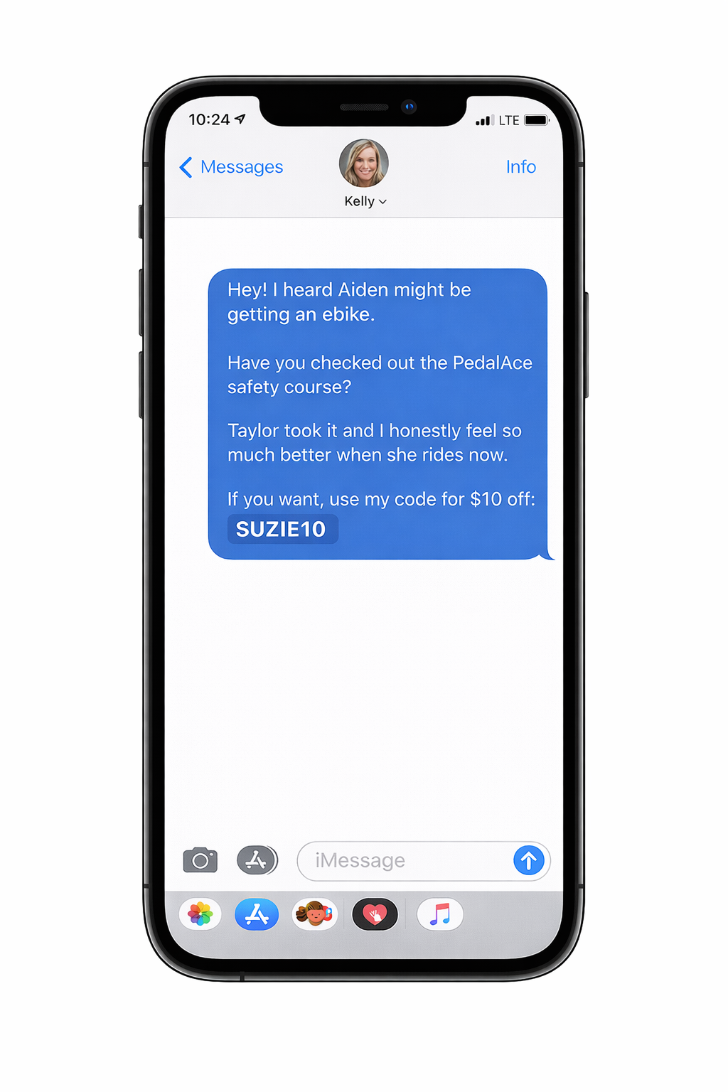 Know a parent whose child has (or wants) an ebike? Invite them to PedalAce. They’ll get $10 off enrollment, and you’ll earn $10 when they sign up.